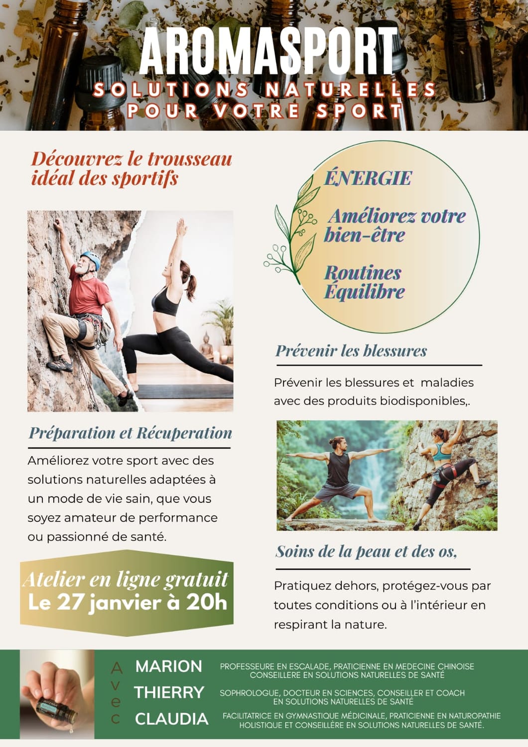 Ce mardi 27 janvier à 20h, 3 conseillers Bien-être, Marion, Thierry et Claudia, vous présentent un atelier spécial sport et huiles essentielles.